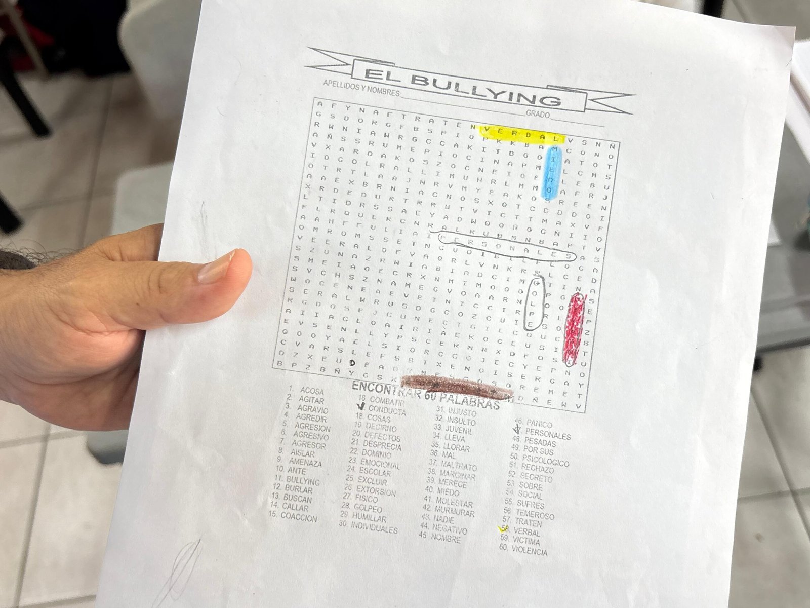 Posteriormente, vieron un video animado de animales que mostraba interacciones de molestia entre ellos, lo cual permitió explicar que esas acciones también representan maltrato, incluso cuando parecen bromas o juegos. Finalmente, realizaron una sopa de letras con palabras relacionadas al maltrato infantil.