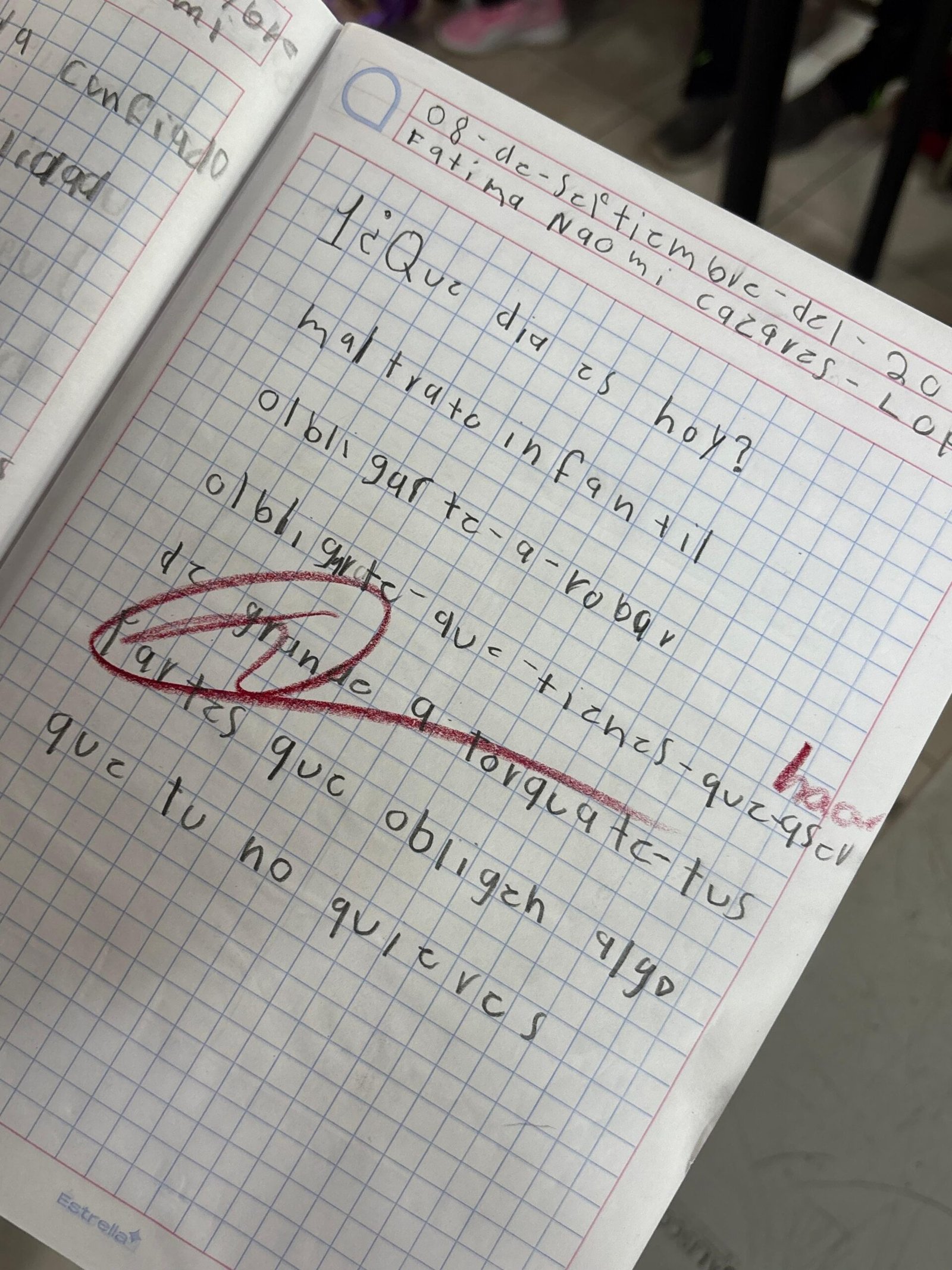 “Vimos pues todo lo del abuso y maltrato infantil porque el maestro nos dijo que el 8 (de septiembre) todas las escuelas hacen esta actividad. Pienso que es más bueno pedir ayuda disimuladamente y así para no poner tu vida más en riesgo…Vimos la sopa de letras, la el dibujo, sobre el abuso y maltrato infantil y pienso que es bueno ver estos temas para aprender más”.