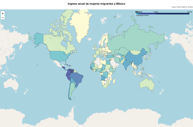 Mapa mundial del origen de las mujeres migrantes registradas en el país por “Eventos de personas en situación migratoria irregular en México en 2024 por país de origen”.
