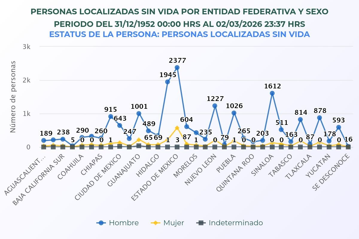 El registro nacional también indica que 21 mil 708 personas fueron localizadas sin vida de 2019 a lo que va de 2029, de ellas, 3 mil 88 son mujeres. Aunque se desconoce la hipótesis de su desaparición, para el Instituto Mexicano de Derechos Humanos y Democracia, como lo señala en su Diagnóstico de mujeres desaparecidas de septiembre de 2022, “la desaparición de mujeres en México oculta otras violencias y delitos para las mujeres”.
