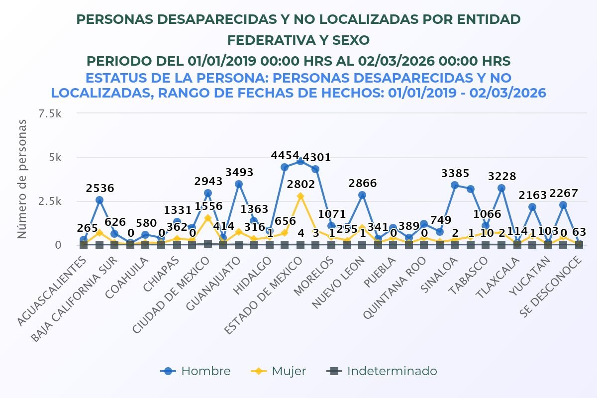 El Registro Nacional de Personas Desaparecidas y No Localizadas (RNPDNO) reconoce que de 2019 a lo que va de 2026 existen 68 mil 885 personas desaparecidas y no localizadas en el país, de las cuales 22% son mujeres.