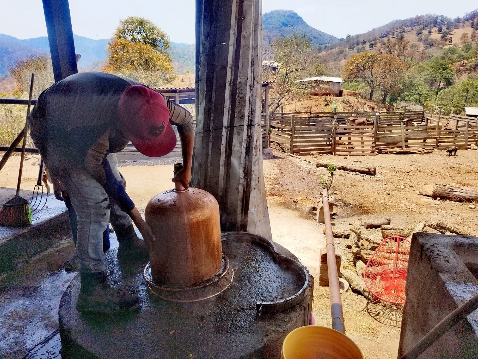 El alambique es una caldera de destilación, donde se depositan los jugos y la fibra del maguey para que mediante la evaporación obtengan el mezcal. Yahir, de 18 años, quien es nieto de Hilario Villanueva Gaona, otro de los productores de mezcal de la zona, explica que el primer destilado que sale lo llaman ordinario, que es la base para una segunda destilación, de donde ya sale el mezcal óptimo que ofrecen y venden.