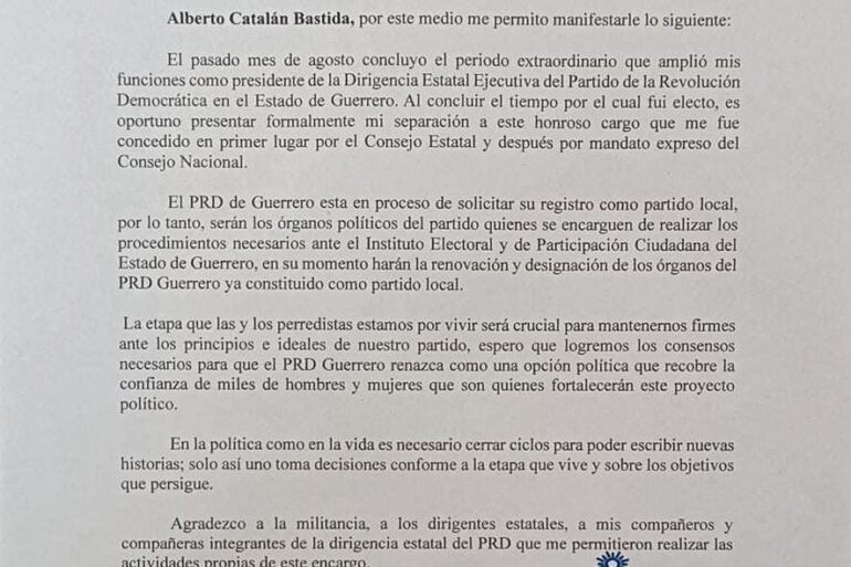 La dimisión se da tres días antes de que termine su periodo de cuatro años. Texto: Jesús Guerrero Foto: Redes Jueves 5 de septiembre de 2024 Chilpancingo El dirigente estatal del PRD, Alberto Catalán Bastida, renunció al cargo este jueves 5 de septiembre, tres días antes de que en la...